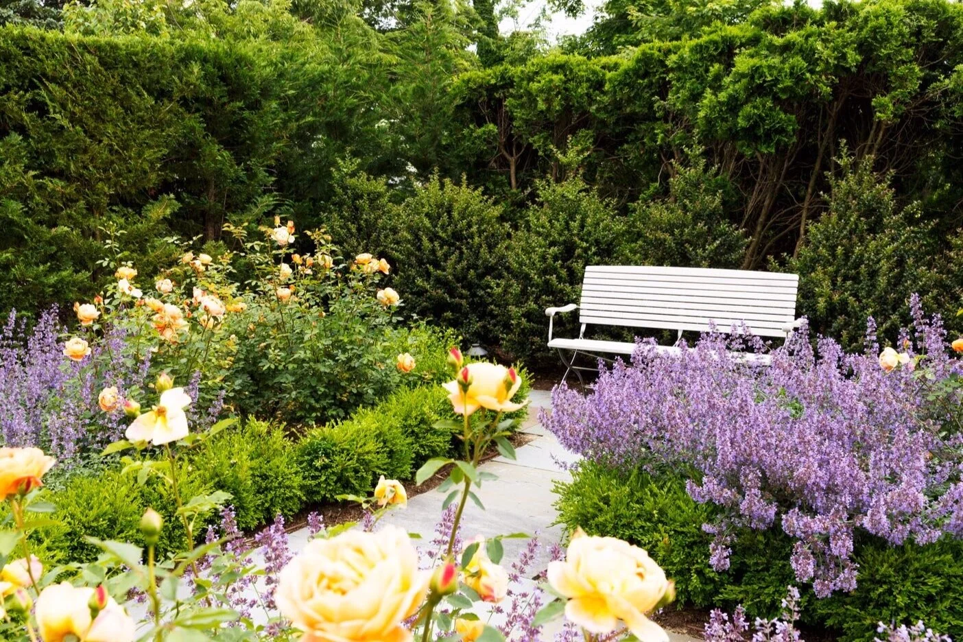 An existing south facing terrace with a fireplace off the kitchen was rejuvenated with new plantings of sweet gum trees to provide shade, and espaliered magnolias. A formal boxwood garden with amber colored everblooming roses is underplanted with lavender cat mint.
